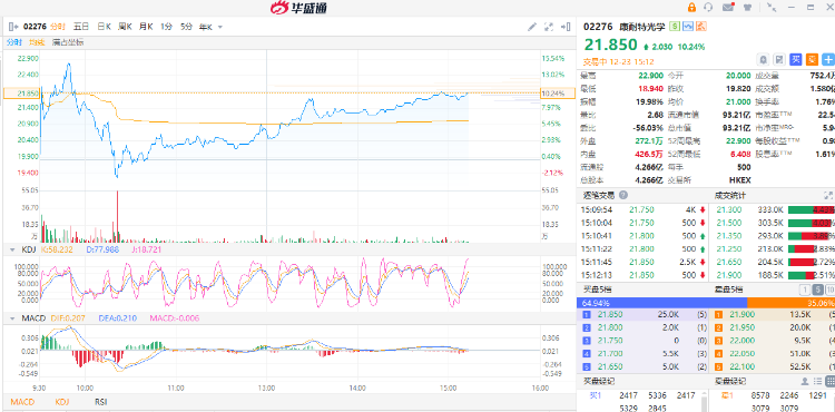 12月23日讯,港股康耐特光学(02276)股价强势,今日盘中一度再涨14%创历史新高,截至发稿涨超10%,年内涨幅超200%。