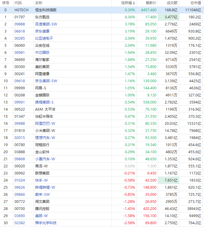 截至发稿,科网股走势分化,百度集团-SW涨超3%,腾讯控股、美团-W跌近2%。互联网医疗股走强,京东健康涨超3%,阿里健康涨超1%。