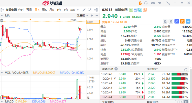 12月24日讯,港股微信小店“送礼”概念再度暴涨!微盟集团暴涨17%,公司近四个交易日股价翻倍;截至发稿,有赞涨超7%,东方甄选涨超6%。