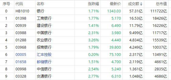 12月24日讯,港股内银股继续领涨!截至发稿,农业银行涨超3%再创历史新高,交通银行、中信银行、中国银行涨超2%,工商银行、建设银行、招商银行涨超1%。