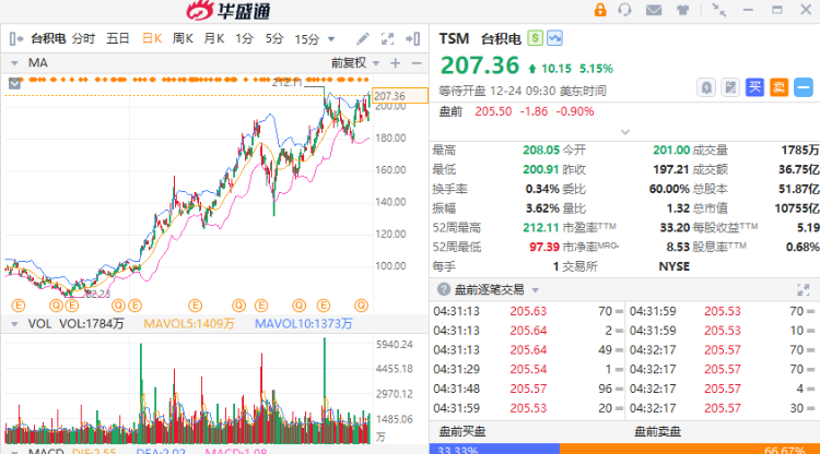 台积电周二(12月24日)股价在盘中创下历史新高,并超过11月创下的收盘纪录高点。这家全球最大的代工芯片制造商有望创下25年来的最佳年度表现。