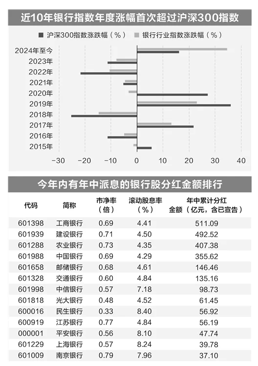 今年以来,银行板块一直以跑赢大盘的速度稳步上涨,行业指数累计涨幅达到34.62%,在全部申万行业中居于首位,跑赢沪深300指数约18个百分点,这也是近10年来银行行业指数唯一一次在上涨的情况下跑赢沪深300指数。