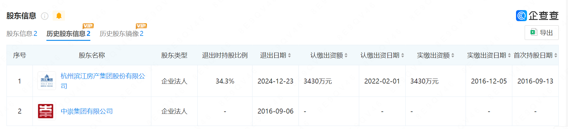 近日,企查查数据显示,滨江集团退出了上海中崇滨江实业发展有限公司(以下简称“中崇滨江”),其持有的34.3%股权由中崇投资集团有限公司(以下简称“中崇投资”)接盘。