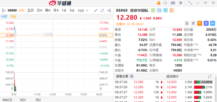 12月30日,思摩尔国际(06969)高开一度逾14%,截至发稿,涨9.06%,报12.28港元,成交额3.31亿港元。