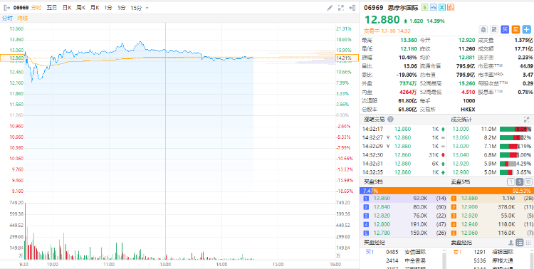 尽管港股多数调整,但是思摩尔国际 $06969.HK 逆势走强。截至发稿,涨14.39%,报12.88港元。