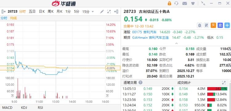 吉利(00175) $00175.HK 早段跌逾3%,股份今年以来表现强势,月中曾高见16港元水平,若认为股价短线有反弹,可以留意吉利认购证(28723) $28723.HK ,行使价18.5港元,明年10月底到期,实际杠杆约3.8倍;相反,认为行业竞争将会持续并拖累吉利股价,可以留意吉利认沽证(29353) $29353.HK ,行使价12港元,明年6月到期,实际杠杆约4.3倍。