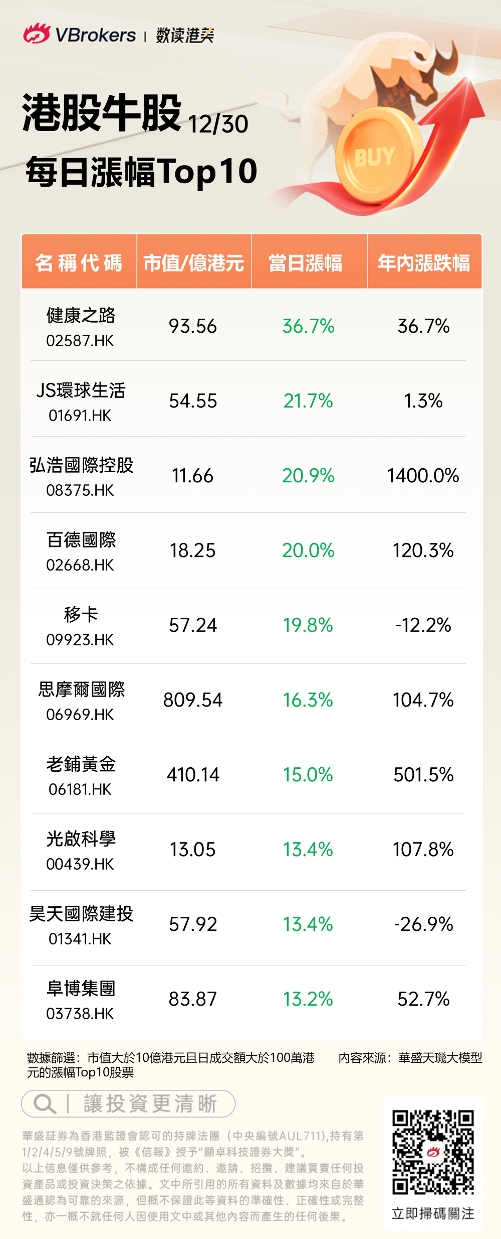 發仔统计了每日港股涨幅Top10,具体名单如下: