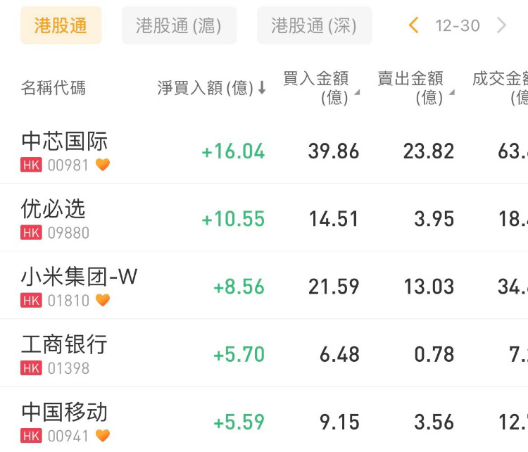 中芯国际、优必选、小米集团-W分别获南下资金净买入16.04亿港元、10.55亿港元、8.56亿港元。