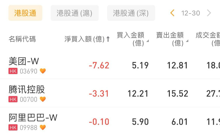 美团-W、腾讯控股、阿里巴巴-W遭净卖出7.62亿港元、3.31亿港元、0.10亿港元。