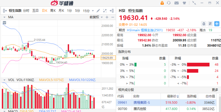 港股于今年首个交易日向下,低开过百点后跌幅急速扩大,一口气由两万关之上回落至19,500点水平。