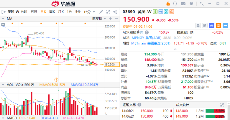 美团-W去年累升约85%,早段股价曾跌穿150元港元,见逾三个月低位。