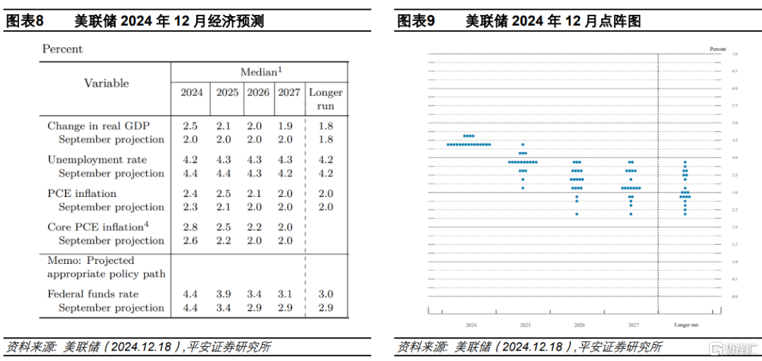 一是,美联储12月议息会议的重要转折。是次会议传递的核心信息是,美联储从此刻开始,将在降息决策上比之前更加谨慎。最新经济预测并未明显上修美国经济和就业前景,但大幅上修2025年通胀预测,继而上修了2025和2026年政策利率路径。鲍威尔在记者会上坦言,一些官员已经开始考虑特朗普新政的影响。12月20日,纽约联储主席威廉姆斯表示,其个人的预测已经考虑到了未来的财政、移民等政策的影响。可见,美联储的这一转变是“特朗普交易”的连锁反应。