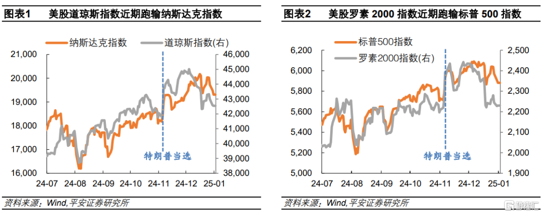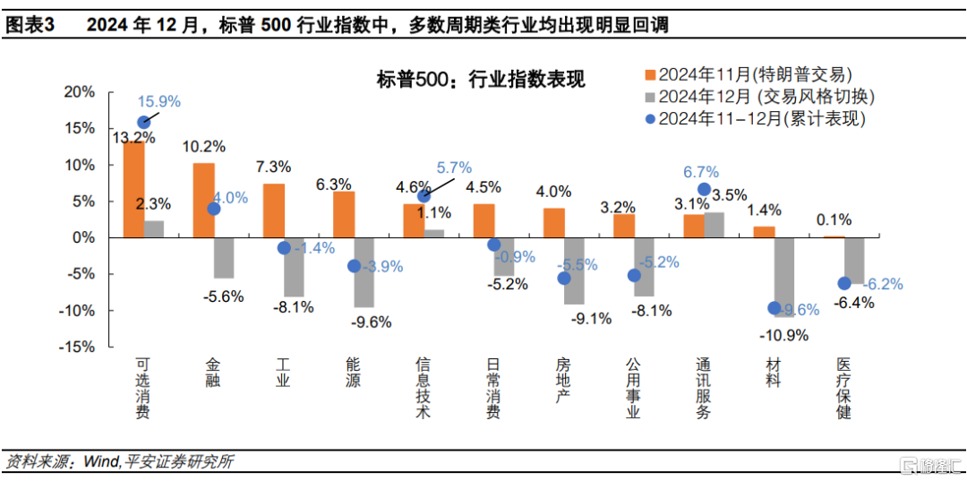 美股方面,大盘波动加剧,风格切换至成长和大盘股占优,此前相对强势的金融、工业、能源、房地产等行业指数转跌,但可选消费、信息技术和通讯服务仍在上涨。2024年11月,道琼斯指数累涨7.5%,高于纳斯达克指数6.2%的涨幅;罗素2000指数更是大幅上涨10.8%,强于标普500指数5.7%的涨幅。12月,道指下跌5.3%,而纳指仍上涨0.5%;罗素2000指数下跌8.4%,跌幅明显深于标普500指数的2.5%。标普500指数中的11个行业中,11月相对强势的行业是可选消费、金融、工业和能源等,而在12月,除可选消费外,其余周期类行业均出现明显回调。同时,信息技术和通讯服务行业,与可选消费一并,成为为数不多保持上涨的行业。