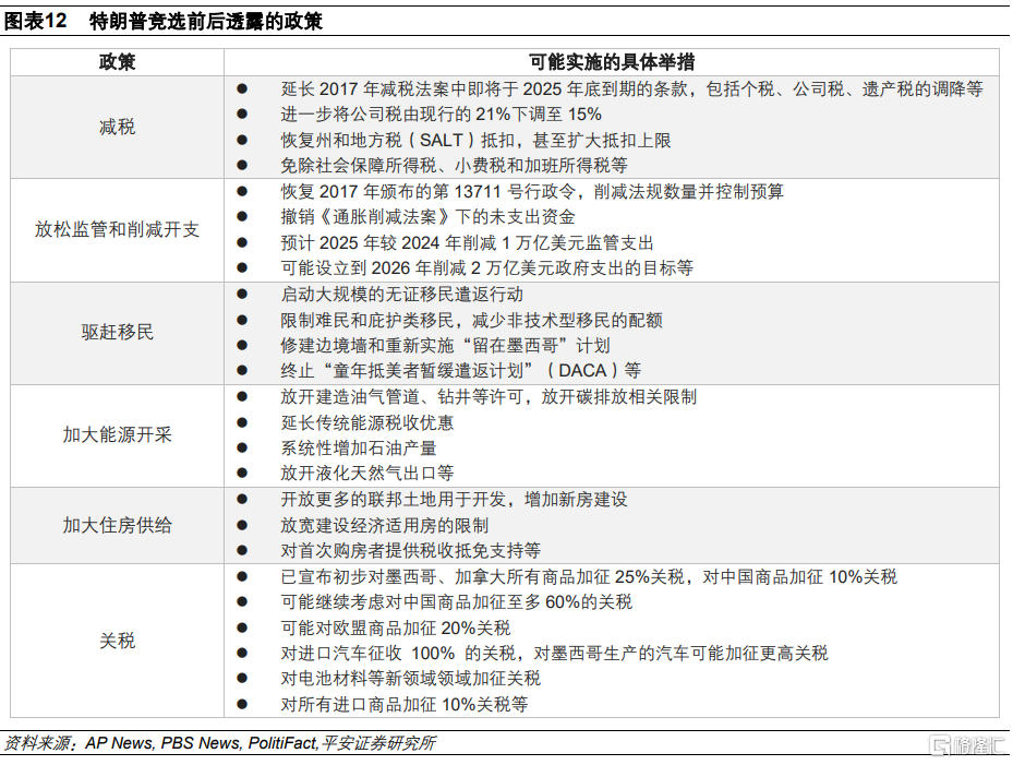 这可能掀起新一轮“特朗普交易”,而具体的交易风格取决于政策力度及“预期差”。特朗普在竞选前后的公开政策表态(见图表12),是市场政策预期的坐标。其中,若移民、关税等政策超预期,可能指向“滞胀交易”(股债承压,美元强势);若这些政策不及预期,或者“去监管”和减少政府支出等政策力度较强,则有望出现“去通胀交易”(股债齐涨,美元走弱)。