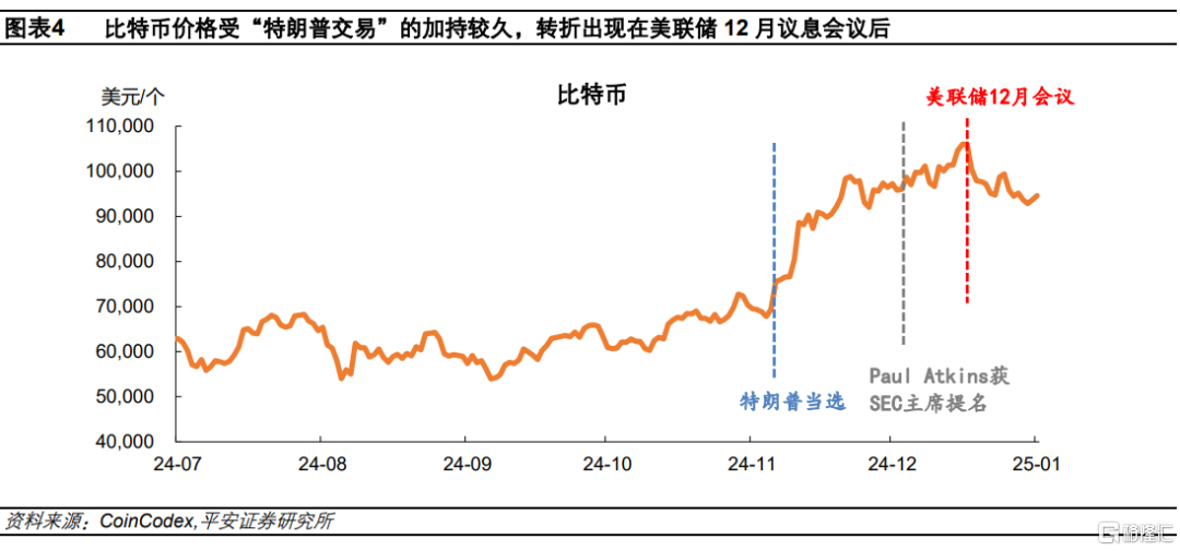 二是,美联储表现出较强的独立性,包括在加密货币问题上。此前,投资者对美联储可能采取的鹰派行动预期不足,一个重要原因或是特朗普在竞选期间,发表了干预货币政策的言论,贝森特甚至还支持设置“影子联储主席”。鲍威尔在12月4日访谈中称,不担心特朗普上台后美联储丧失独立性,同时驳斥了“影子主席”的可能性。12月8日,特朗普表示不会解职美联储主席鲍威尔,进一步缓解了有关美联储独立性的担忧。鲍威尔在12月18日记者会上表示,美联储无意参与政府囤积比特币的任何计划,某种程度上也是美联储独立于国会权力的体现。此外,继12月议息会议出现反对票,市场更加意识到,2025年美联储票委轮换,可能令美联储内部出现更多分歧,但也意味着特朗普对于货币政策的干预难度更大。总之,一个更加独立于特朗普政权的美联储,促进了“紧缩交易”的回温。