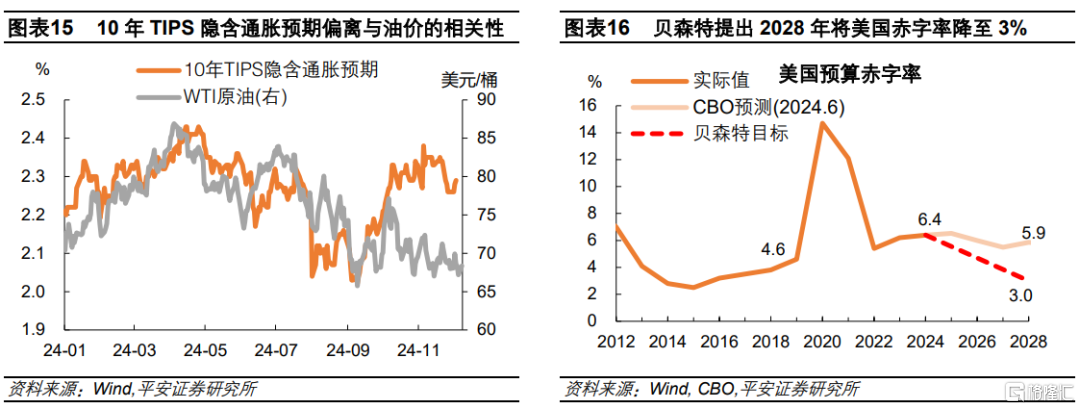 “去监管”和减少支出对应的交易方向是“去通胀”,或者说是“滞胀”的反面。开放能源生产的政策,可能帮助抑制油价,但在现阶段或难改善市场对中长期通胀的担忧,毕竟目前10年美债隐含通胀预期与油价走势仍显著背离。在改善通胀预期上,“去监管”和减少政府开支,是特朗普政府为数不多的途径。我们在报告《2025年海外经济展望:动荡伊始》中提示,特朗普政府在放松监管和削减开支方面有较高的优先级,监管成本节约的空间也很大。特朗普当选以来,执掌“政府效率部”的马斯克仍在频繁发表涉政言论,对这一部门在协助“去监管”上发挥的作用或不宜低估。贝森特提出的3%赤字目标,与2024财年6.4%的赤字率以及CBO在2024年6月预计的赤字路径相比,似乎难以完全实现,但这并不妨碍新财长在管控赤字方面加大行动,如是,可能引发“贝森特交易”重启。