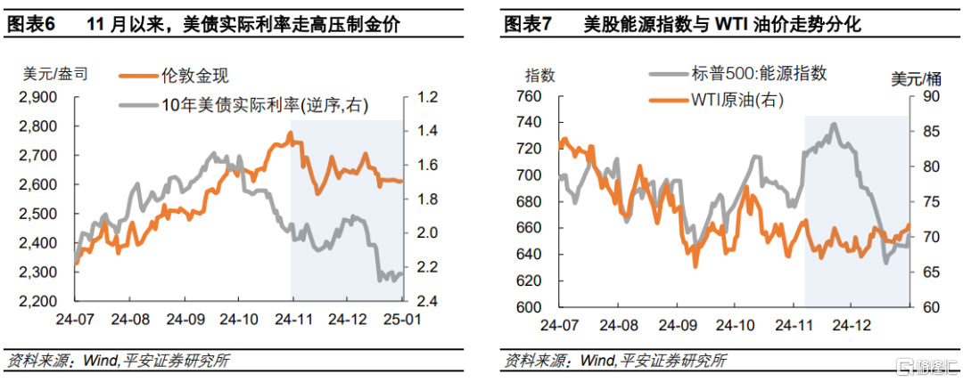 同时,黄金、原油价格仍然缺乏方向。2024年11月以来,特朗普当选对金价和油价而言利弊并存。黄金方面,尽管特朗普的政策可能增加全球经济政治不确定性,继而增添黄金的避险价值,但持续走强的美债利率(尤其实际利率)和美元汇率,对金价产生直接压制。原油方面,特朗普主张放开能源开采限制,这一点有利于油企增产增利,美股能源股在11月前半程明显走高。不过,美油增产可能进一步加剧全球原油供给过剩风险,并且最终取决于欧佩克+产油国的应对,所以油价仅呈现窄幅波动。11月下旬以来,“贝森特交易”(其主张能源增产)、高利率和强美元等,先后冲击能源企业股价,但已处全年低点的油价缺乏下跌空间,继续保持震荡。