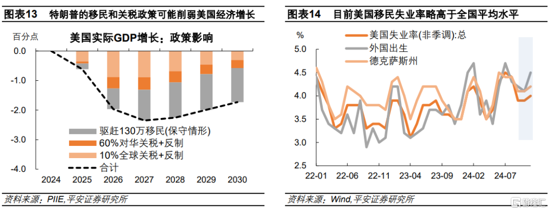 移民和关税政策对应的交易方向是“滞胀”。“滞”的方向较容易理解,驱赶移民将引发人口及消费需求的减少,关税将通过抬升物价而抑制消费需求。参考PIIE测算,“全球基线关税10%+对华关税60%+贸易对手反制”的组合,或在未来十年拖累美国实际GDP增长0.4-1.3个百分点,驱赶移民政策可能拖累2025年美国经济增长0.2-1.2个百分点。而移民政策对货币政策的影响值得辨析。我们观察,美国“外国出生”和边境移民较多的“德克萨斯州”失业率水平,在2020年以前均低于全国平均水平,但是疫情后呈现赶超趋势,2024年9-11月已经略高于全国平均水平。这或说明,边境移民的减少在短期可能同时减少失业人数(分子)和劳动力供给(分母),压制整体失业率水平。同时,劳动力供给的减少也可能加大工资上行风险,令美联储更难降息,因此更可能对应“紧缩”甚至“滞胀”交易。