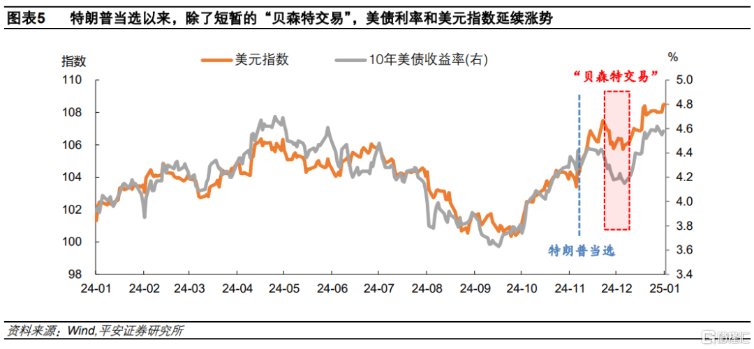 不过,美债利率和美元指数基本延续涨势,除了短暂的“贝森特交易”期外。除了在2024年11月22日,特朗普提名贝森特为美国新财长后,因其主张管控赤字,而引发了为期两周左右的“贝森特交易”:10年美债利率短暂跌破4.2%,美元指数短暂跌破106。但很快,12月中旬以后,美债利率和美元指数恢复涨势。截至12月27日,10年美债利率突破4.6%、创8个月新高,美元指数多次站上108,创近两年新高。