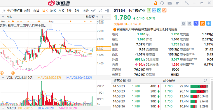 智通财经APP获悉,中广核矿业(01164)高开逾3%,截至发稿,涨8.54%,报1.78港元,成交额2.32亿港元。