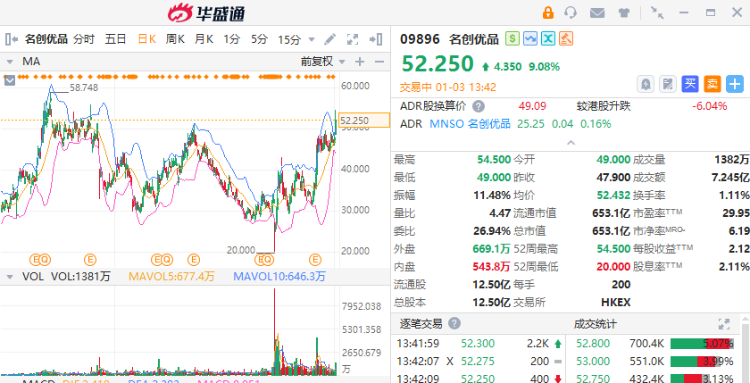 今日港股延续震荡,但部分个股续创近一年新高,比如名创优品在开年以来持续走强。截至发稿,涨9.71%,报52.55港元。