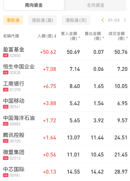 盈富基金、工商银行、中国移动分别获南下资金净买入50.62亿港元、6.75亿港元、3.88亿港元。