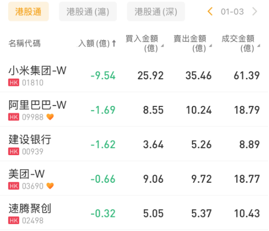 小米集团-W、阿里巴巴-W、建设银行遭净卖出9.54亿港元、1.69亿港元、1.62亿港元。
