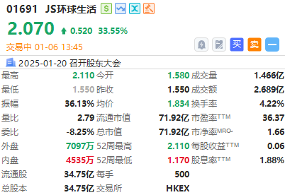 JS环球生活( $01691.HK )午后短线拉升,一度升至2.11港元,为年内高位,截至发稿,报2.07港元,涨33.55%,成交额2.689亿港元。