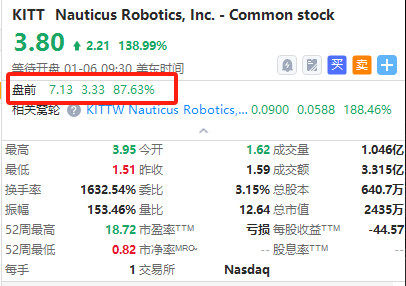 机器人概念股盘前集体飙升。截至发稿,Nauticus Robotics $KITT 暴涨87%,,Guardforce Al $GFAI 涨超44%,Richtech Robotics $RR 涨39%,Serve Robotics $SERV 涨15%。