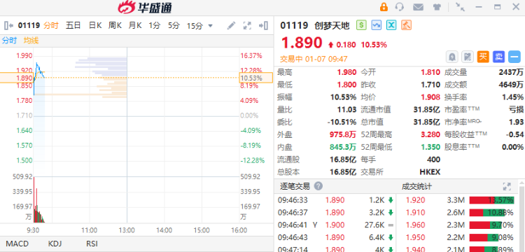 1月7日,创梦天地(01119)高开近6%,截至发稿,涨10.53%,报1.89港元,成交额4649万港元。