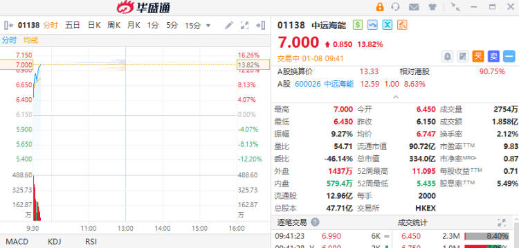 1月8日,中远海能(01138)早盘走强,截至发稿,涨13.82%,报7港元,成交额1.858亿港元。