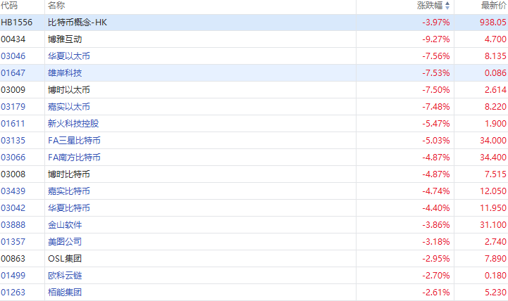 加密货币ETF及相关概念股全线下挫,截至发稿,博雅互动跌超9%,华夏以太币、雄岸科技跌超7%,新火科技控股、FA三星比特币跌超5%。