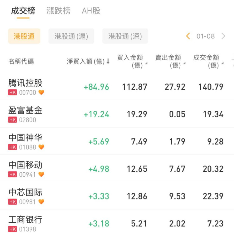 腾讯控股、盈富基金、中国神华分别获南下资金净买入84.96亿港元、19.24亿港元、5.69亿港元。