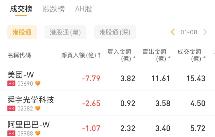 美团-W、舜宇光学科技、阿里巴巴-W遭净卖出7.79亿港元、2.65亿港元、1.07亿港元。