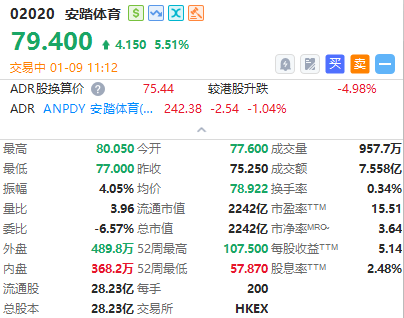 安踏体育(02020)盘初向好,截至发稿,涨5.51%,报79.4港元,成交额7.56亿港元。