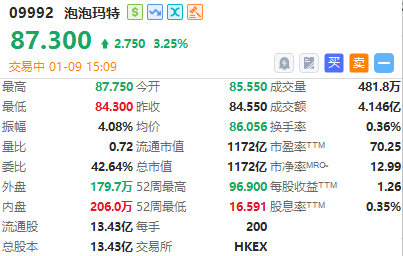 泡泡玛特(09992)涨超3%,截至发稿,涨3.25%,报87.3港元,成交额4.1亿港元。