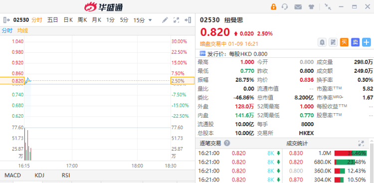 港股纽曼思正在暗盘交易中,截至发稿涨2.5%,报0.82港元/股,中签一手赚160港元,最新总市值超8亿港元。该股预计将于1月10日正式挂牌上市,配售结果将于今日晚间披露。