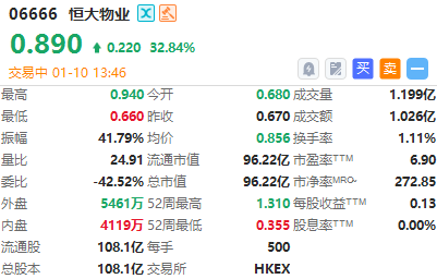 1月10日消息,港股恒大物业股价大涨逾32%,报0.89港元,成交额1.026亿港元,总市值96.22亿港元。