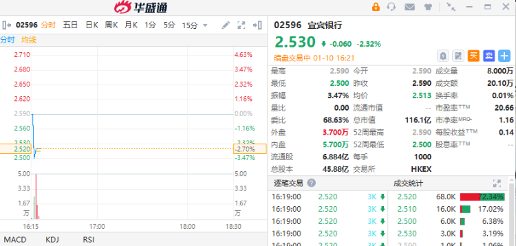 华盛资讯01月10日讯,港股宜宾银行正在暗盘交易中,截至发稿跌2.32%,报2.53港元/股,中签一手亏60.0港元,最新总市值超116亿港元。该股预计将于1月13日正式挂牌上市,配售结果将于今日晚间披露。