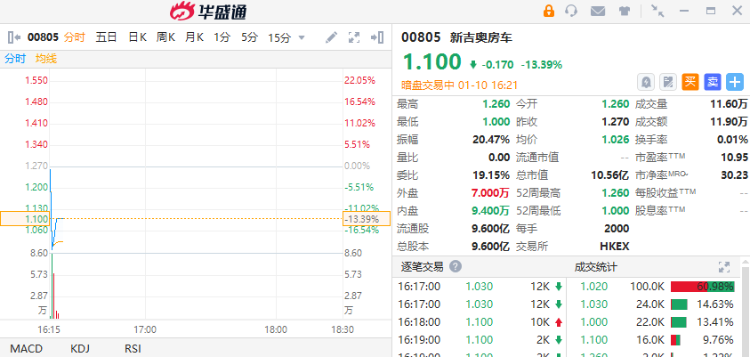 港股新吉奥房车正在暗盘交易中,截至发稿跌13.39%,报1.10港元/股,中签一手亏340.0港元,最新总市值超10亿港元。该股预计将于1月13日正式挂牌上市,配售结果将于今日晚间披露。