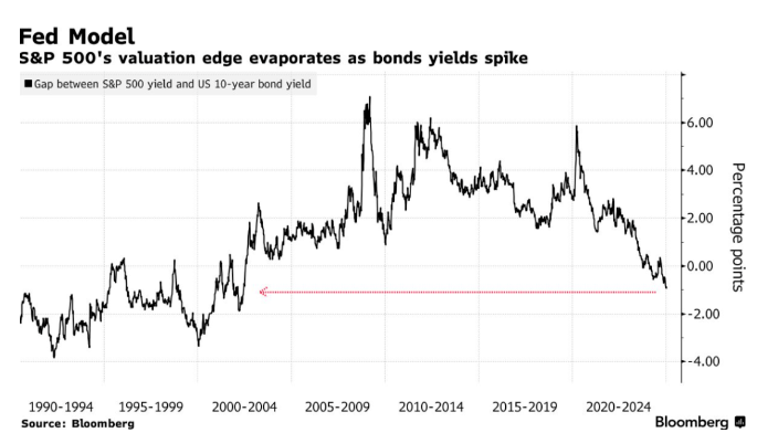 投资者已经看到了这一点。标普500指数的收益率比10年期美债的收益率低1个百分点,这种情况上次出现在2002年。换句话说,与美国股票基准相比,拥有风险更低的资产的回报率已经很久没有这么好了。