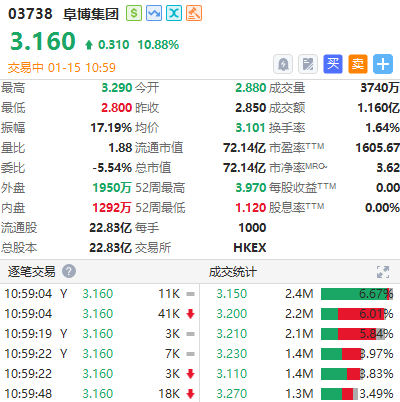 阜博集团 $03738.HK 再涨超15%,本周累涨超25%。截至发稿,涨10.88%,报3.16港元,成交额1.16亿港元。