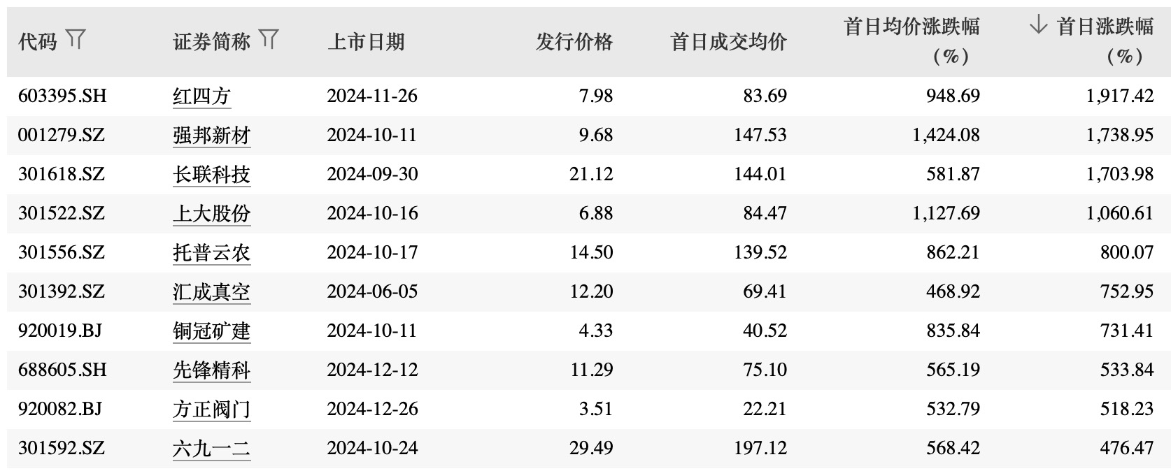 红四方、强邦新材(001279.SH)、长联科技(301618.SZ)及上大股份(301522.SZ)首日涨幅均超过1000%,可以说是涨势凶猛。