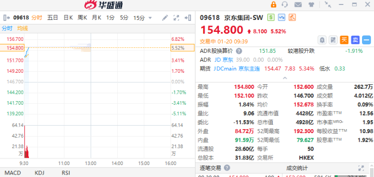1月20日,京东集团-SW(09618)高开逾4%,截至发稿,涨5.52%,报154.8港元,成交额4亿港元。