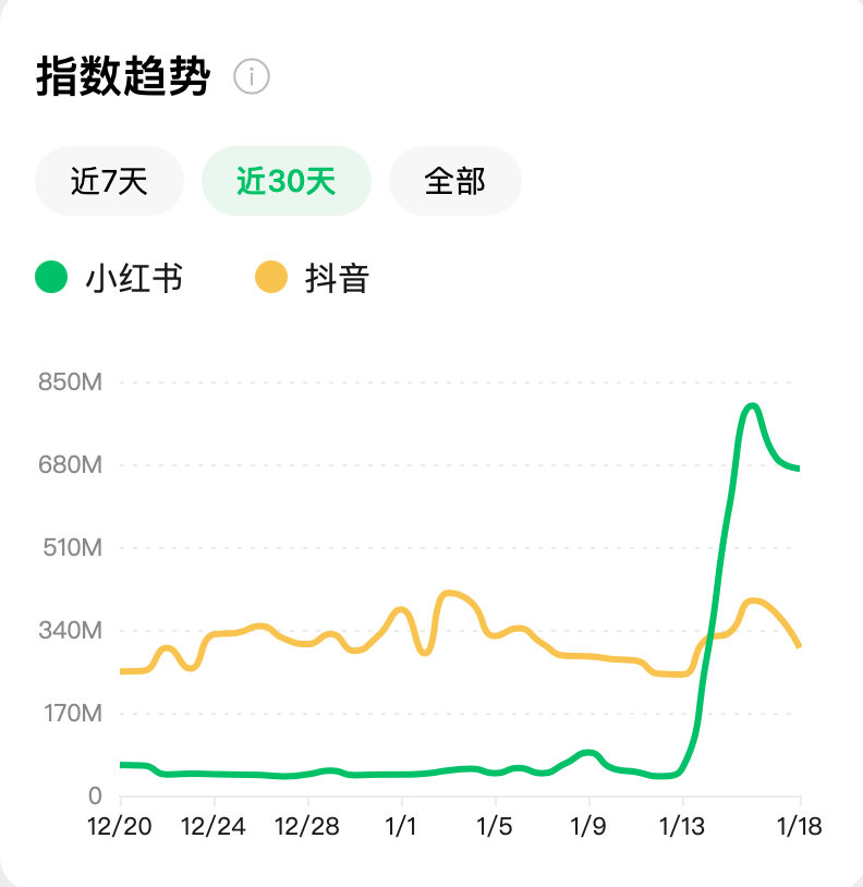 这对于有着超过1亿日活、3亿月活的小红书而言,算不上是一个太大的数字。在满屏外国人的用户感知之外,真正让小红书获益最大的,或许是它在舆论场上的声量。微信指数显示,1月14日,小红书的微信指数瞬间从平日的千万量级攀升至2.74亿,随后又在1月16日攀升至8亿的高点,几乎是同一天抖音微信指数的两倍。