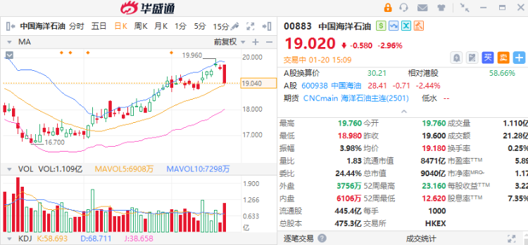 石油股集体走低,截至发稿,中国海洋石油(00883)跌3.06%,报19港元;昆仑能源(00135)跌1.98%,报7.43港元;中石油(00857)跌1.77%,报6.12港元;中海油服(02883)跌1.07%,报7.38港元。