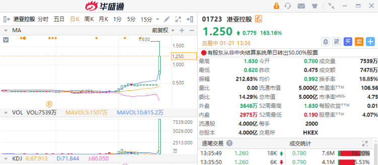 港亚控股(01723)复牌高开逾64%,盘中一度涨超200%,截至发稿,股价上涨163.16%,现报1.25港元,成交额7478万港元。