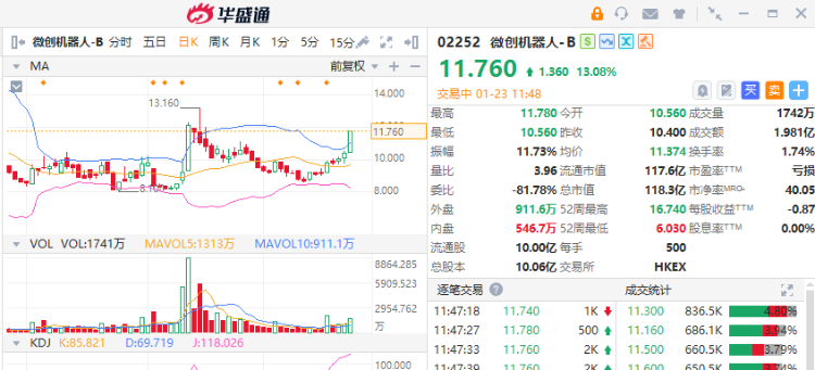 微创机器人-B(02252)早盘上涨12.69%,现报11.72港元,成交额1.94亿港元。