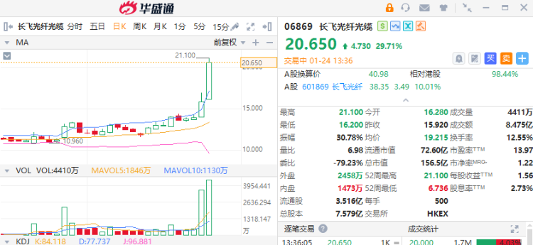 1月24日,长飞光纤光缆(06869)再度走强,截至发稿,涨29.71%,报20.65港元,成交额8.48亿港元。