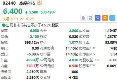 濠暻科技(02440)涨幅扩大逾680%,现报6.4港元,成交额1.287亿港元。